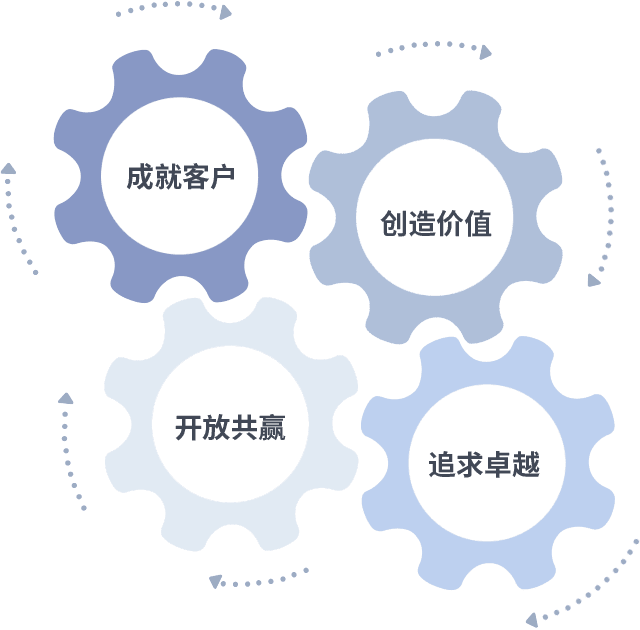 成就客户是一切决策的出发点,,创造价值是衡量所有工作的标准,,追求卓越是我们做事做人的态度,,开放共赢是我们的格局也是最终的结果。。。。价值观的齿轮环环相扣,,推动着组织里的每个人不断向前。。